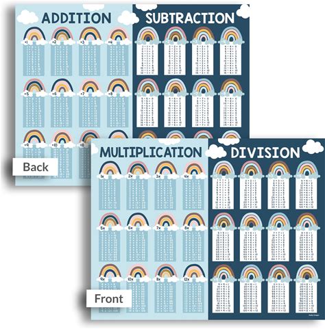 Blulu 4 Pcs Educational Math Posters Laminated Multiplication Chart Division Addition Subtraction Posters Times Table Chart For Kids Elementary And