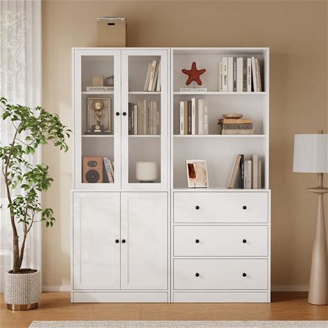 TUSY 71" H Bookshelf With Storage, 6-Tier Modern Bookshelves With 3 Large Drawer, Display Bookcase With Glass Doors, Modern 5-Tier Curio Cabinet For