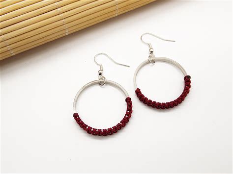 Silver Hoop Earrings: Braided Macrame, Bordeaux Cord, Ethnic Jewelry