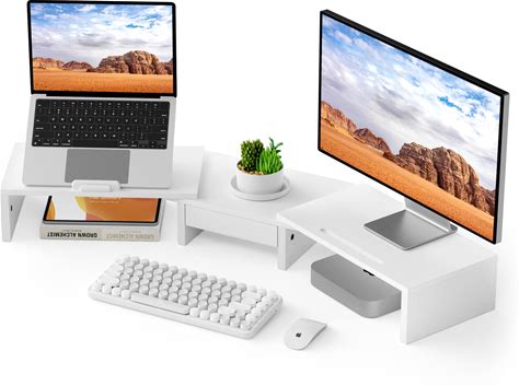Dual Monitor Stand Riser - Computer Monitor Stand For 2 Monitorsoffice Desktop Organizeradjustable Length And Angle 3 Shelf With Storage Drawer