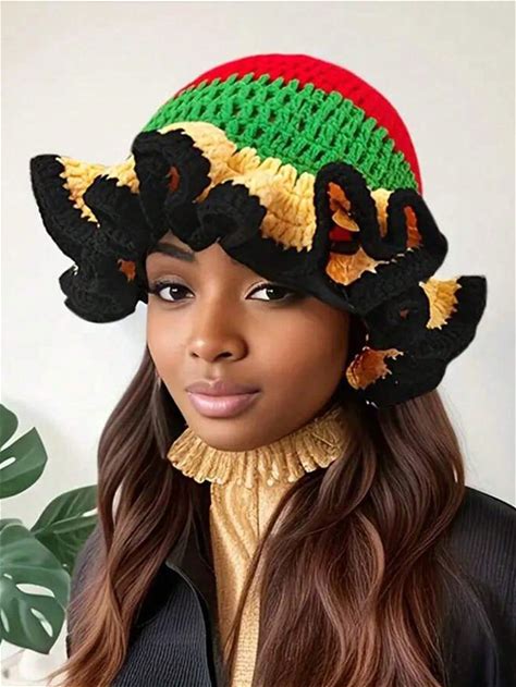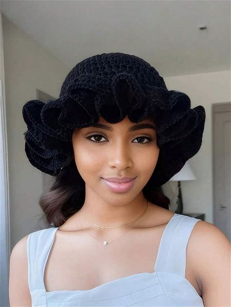 1Pc Women's Y2K Style Handmade Crochet Ruffle Edge Knitted Hat,Hollow Knit Bucket Hat, Suitable For Daily Wear, Photography, Party, Picnic, Outdoor,