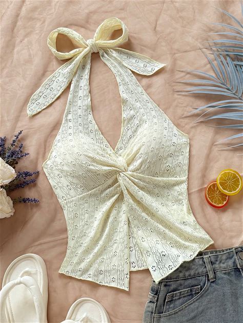 Fashionable Sexy Halter Neck Tied Twist Hem Slit Open Back Camisole,Boho,Vacation,S