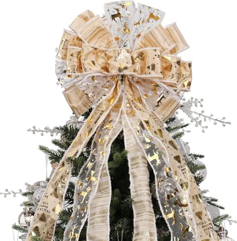 Christmas Tree Topper, 40X13 Inches Toppers Bow With Glitter Satin Mesh Streamer And Patterned Ribbon, Christmas Tree Topper Bow For Christmas Home Decoration (White)