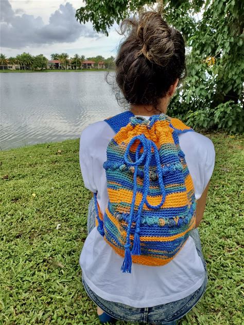 Handmade Crochet Backpack: Colorful Knit Drawstring Bag