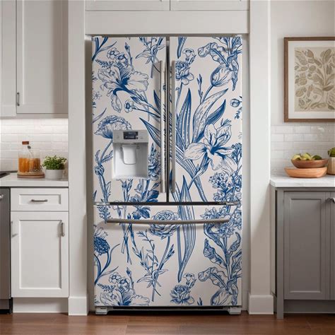 Refrigerator Wrap. Refrigerator Cover Retro Floral Blue Pattern. Removable Fridge Decal For Side-By-Side, French Door, Etc.