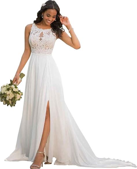 Fashionbride Women's Wedding Dresses For Bride Chiffon Slit Appliques Lace A-Line Beach Bridal Gowns