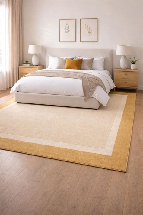 Neutral Beige Wool Area Rug | Golden Border, Modern Minimalist Carpet