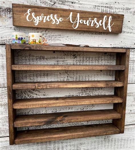 Wooden Coffee Cup Mug Rack with Shelf.Rustic Modern Wood Wall M