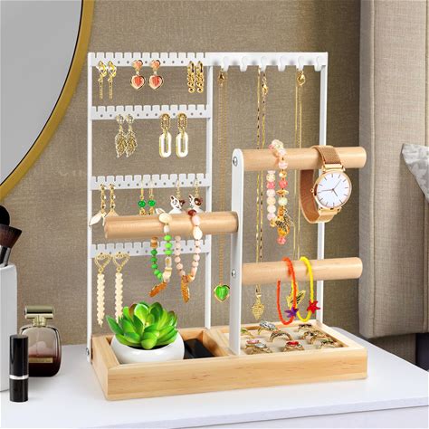 Godboat Jewelry Organizer, 4-Tier Earring Holder Organizer With 48 Holes, 6 Hooks Necklace Rack, Bracelet And Ring Stand With Wood Box, Gifts For