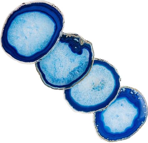 Nature's Decorations Blue Silver Rimmed Agate Stone Coasters - Set Of 4, Polished Geode Drink Mats For Dining & Coffee Table & Kitchen Geode Decor